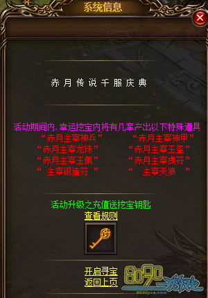 活动内容:活动期间内,玩家通过幸运挖宝系统,有几率获得“赤、月、传、说、千、服、庆、典”这八个特殊活动字帖,集齐字帖可兑换相应奖品。