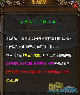 19:45分刷新1只超级Boss[黄金火龙皇]击杀Boss后超高爆率掉落终极首饰、顶级武器、特殊戒指、元宝等极品道具。