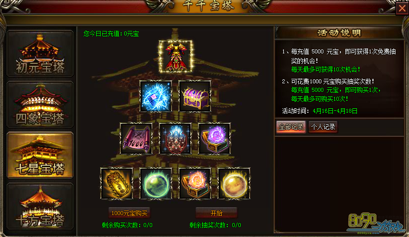 1、每充值1000元宝,即可获得1次免费抽奖的机会!