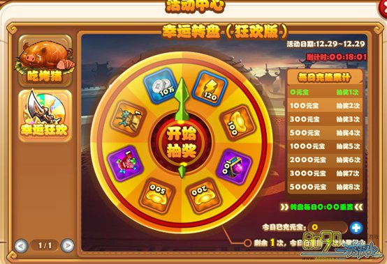 简介:根据玩家当天的充值元宝数,获得抽奖次数,抽取转盘中的奖励,转盘每天重置,奖励不会重复获得。