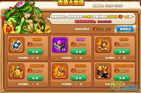 简介:活动期间充值的每一笔元宝,可获得红利积分,红利积分可在活动期间的商店内购买商品,商品每天刷新。