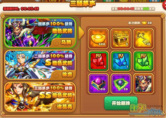 简介:玩家点击开始翻牌后,点击每一张牌进行抽奖,每次抽将的价格会随之上升,抽到武将时,会进入下一顾的翻牌阶段,直到最后获得神将时结束。活动每天重置