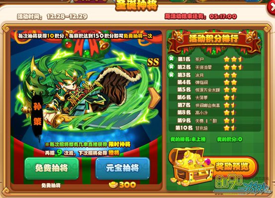 Ps:图为圣诞版的限时神将,前3名可获得神将,每轮持续2天,普通版每轮持续3-4天,前10名都可获得神将
