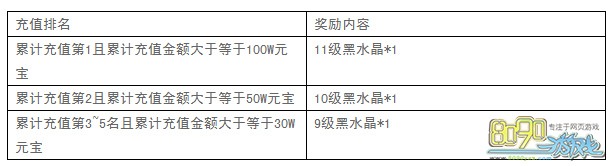 【活动说明】: 活动期间,本服累计充值排名前5名便可获得丰厚奖励!排名第1更可获得11级黑水晶的奖励!累积充值300000元宝即可参与排名!活动结束后,奖励通过邮件发放!