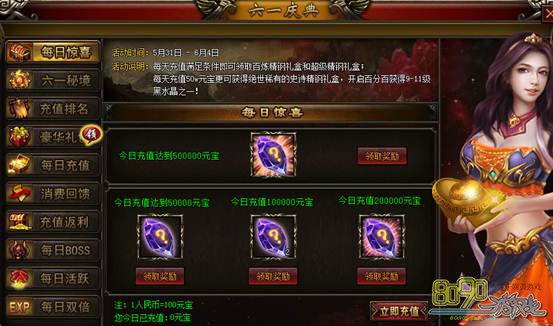 【活动说明】:每天充值满足条件即可领取百炼精钢礼盒和超级精钢礼盒;每天充值50W元宝更可获得绝世稀有的史诗精钢礼盒,开启百分百获得9-11级黑水晶之一