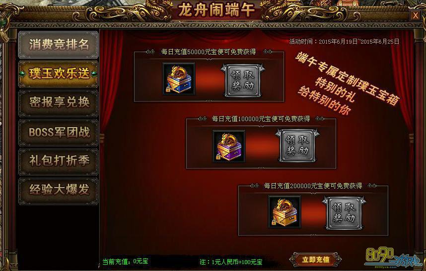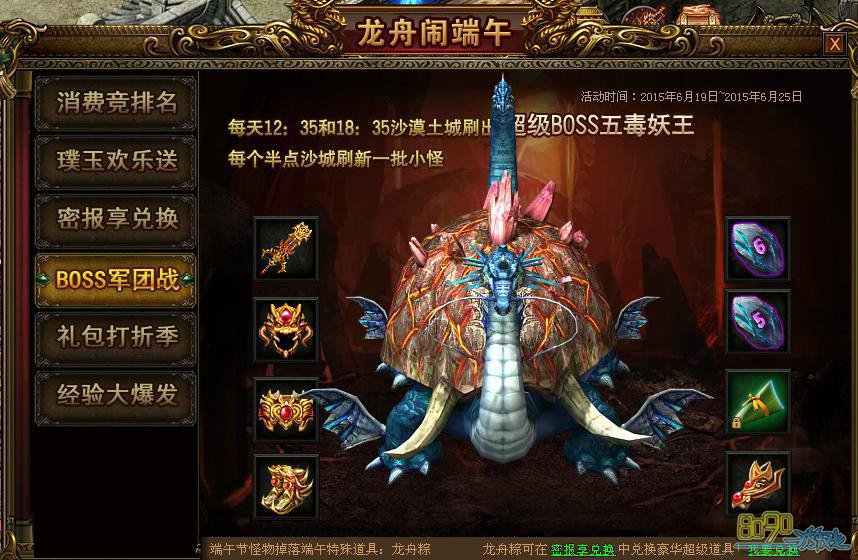 【活动内容】:每天12:35和18:35沙漠土城刷出超级BOSS五毒妖王,每个半点沙城刷新一批小怪。怪物均掉落端午节特殊道具-龙舟粽,BOSS还有几率掉落盘古等极品装备。