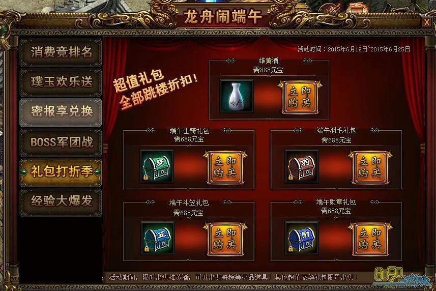 【活动内容】:活动期间,一大波礼包清仓打折出售,更有888元宝1个的雄黄酒出售,雄黄酒使用后获得6级黑铁*1、星辰石*10、官爵丹(小)*10、命力丹(小)*10、龙舟棕*20
