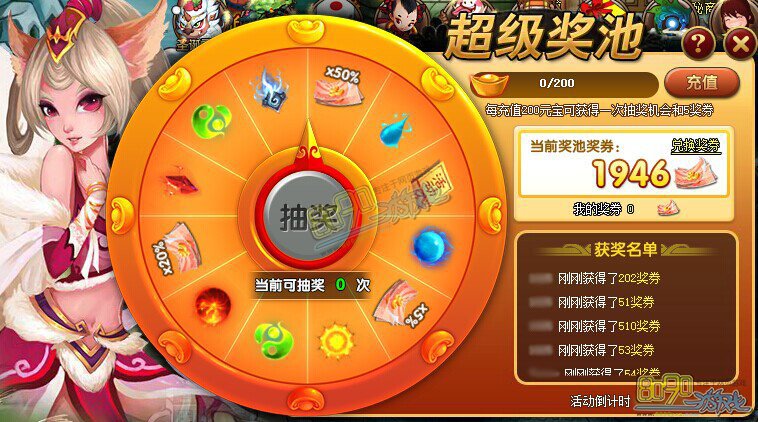 1、活动期间,每次累计充值200元宝即可进行1次幸运抽奖,并可额外获得5奖券的返利奖金