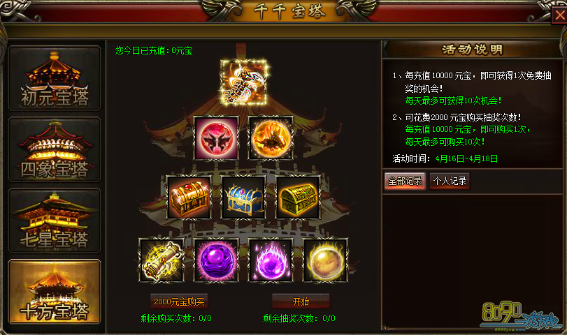 每充值1000元宝,即可购买1次,每天最多可购买10次!