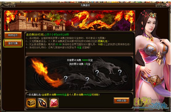活动详情:活动期间全服所有玩家累计消费达到指定元宝数时,将可激活火龙图腾;火龙图腾激活后,个人消费满足相应要求即可领取对应图腾礼包;完全激活图腾后,每天22:00系统将在世界范围发放大量礼券,50级以上玩家记得保持在线,还有几率获得元宝奖励哦!