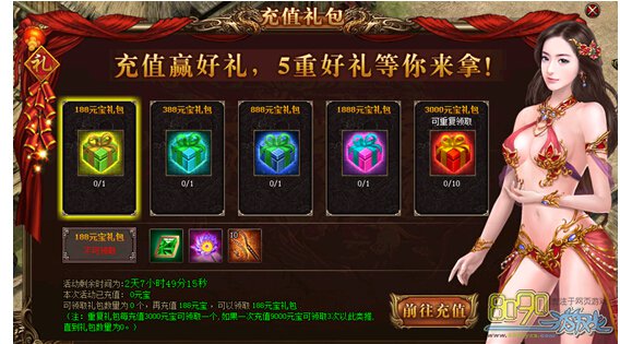 活动详情:活动期间充值达到指定元宝数,即可领取一份对应充值礼包,3000元宝礼包更可重复充值领取10次,每充值3000元宝可领取一个,直到礼包数为0为止。