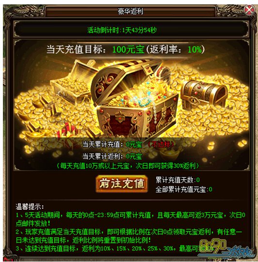 活动详情:活动期间,每天0:00-23:59可累计充值,且每天最高可返3万元宝,次日0点邮件发放。玩家充值满足当天充值目标,即可根据比例在次日0点领取元宝返利,有任意一日未达到充值目标,返利比例将重置到初始比例。连续达到充值目标,返利为10%、15%、20%、25%、30%,最高可到30%。