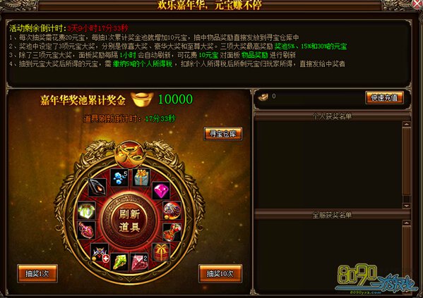 2、转盘面板奖励每隔1小时自动刷新,可花费10元宝对面板奖励快速进行刷新。