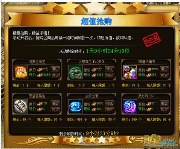 活动详情:活动开启后,抢购区商品每隔一段时间刷新一次,玩家可通过超低的价格抢购各种稀有道具,限量发售,物超所值,欲购从速!