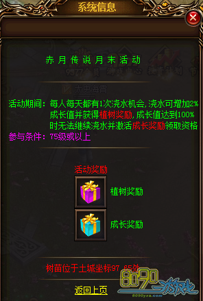 【活动内容】活动期间,75级或以上的玩家每人每天都有一次浇水的机会,每次浇水树可获得2点成长值,浇水的玩家可获得1个植树奖励;当树木的成长值达到100时,不可继续浇水,此时全服75级以上玩家可在此领取1个成长奖励;每天的24点清零