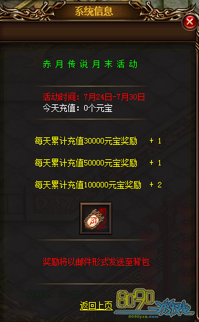 参与方式:玩家可打开右上角【节日活动】图标,或者在赤月皇城148,89【节日使者】处查看活动内容