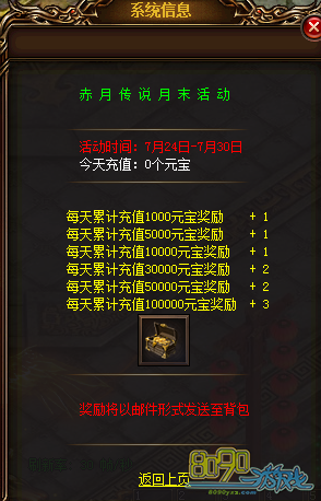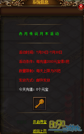 【活动内容】活动期间,每天每充值2000元宝可获得1把挖宝钥匙(每天上限25把,邮件发送)