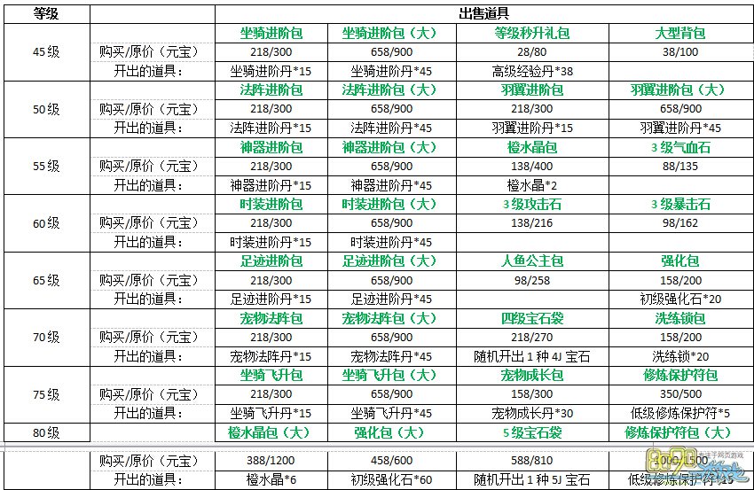 l 累计充值10000元宝:高级铜币卡*45、初级强化石*30、进阶丹*60、橙水晶*3、属性丹*2、4级宝石袋*2、极品魔戒*1