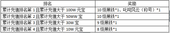 【活动内容】:每天累计充值5W元宝可领取1个百炼黑铁礼盒,累计充值10W元宝可继续领取2个百炼黑铁礼盒(开启后可获得7~9级黑铁之一),累计充值20W元宝还可获得1个超级黑铁礼盒)(开启后可获得8~10级黑铁之一)