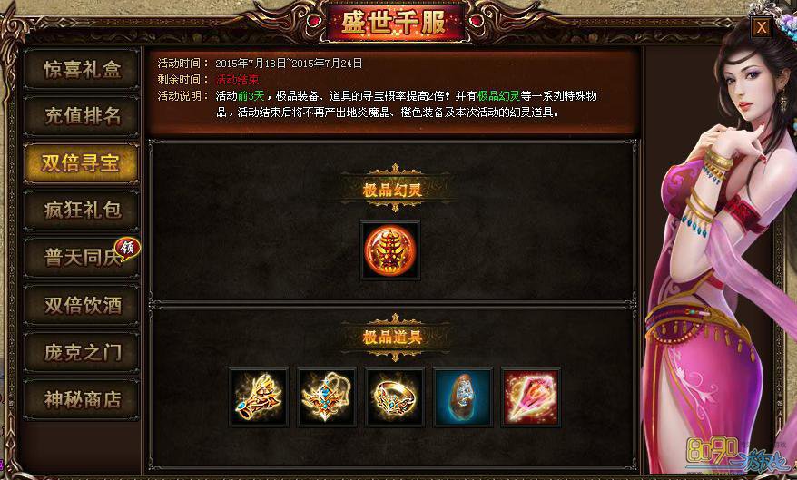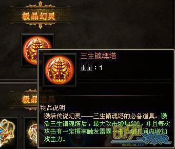 【活动内容】: 活动前3天,极品装备、道具的寻宝概率提高2倍!并有极品幻灵等一系列特殊物品,活动结束后将不在产出地炎魔晶、橙色装备以及本次活动的幻灵道具:三生镇魂塔!