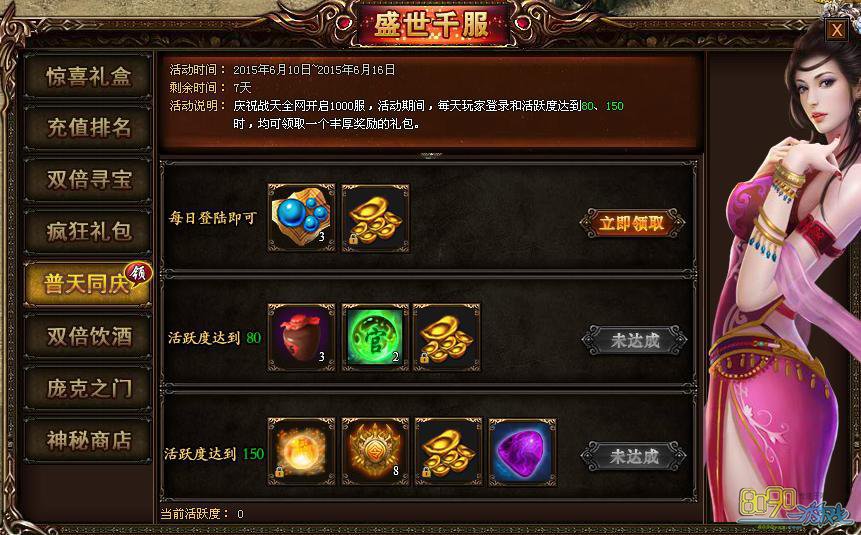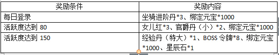 【活动内容】: 庆祝战天全网开启3000服,活动期间,每天玩家登录和活跃度达到80、150时,均可领取一个丰厚奖励的礼包