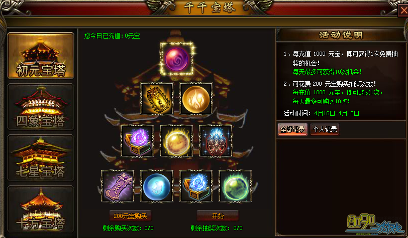 1、每充值1000元宝,即可获得1次免费抽奖的机会!