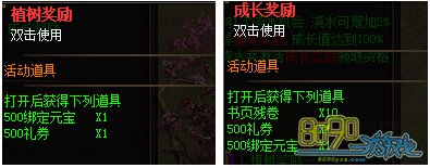 【活动内容】活动期间,75级或以上的玩家每人每天都有一次浇水的机会,每次浇水树可获得2点成长值,浇水的玩家可获得1个植树奖励;当树木的成长值达到100时,不可继续浇水,此时全服75级以上玩家可在此领取1个成长奖励;每天的24点清零