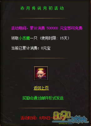 【活动内容】活动期间累计消费50w元宝可获得小恶魔一只