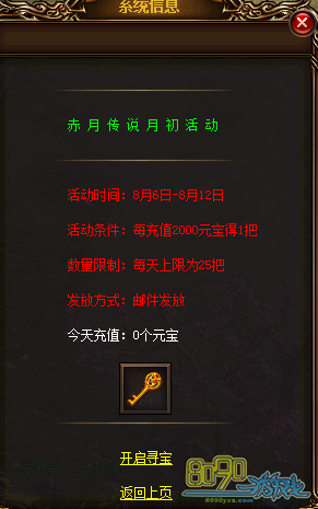 【活动内容】活动期间,每天每充值2000元宝可获得1把挖宝钥匙(每天上限25把,邮件发送)