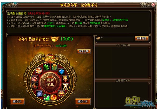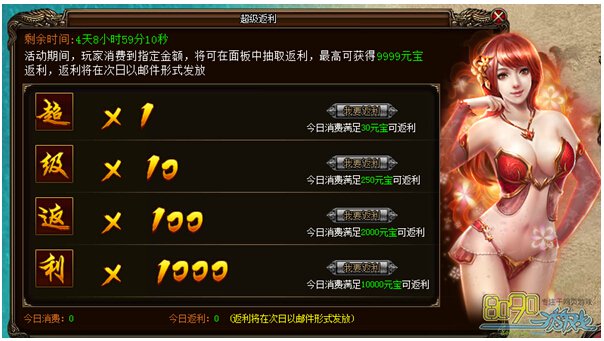 活动详情:活动期间,玩家消费到指定金额,即可在面板中抽取返利,最高可获得9999元宝返利。返利将在次日以邮件形式发放。