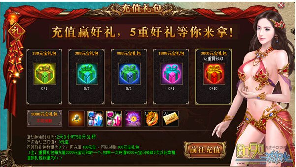 活动详情:活动期间充值达到指定元宝数,即可领取一份对应充值礼包,3000元宝礼包更可重复充值领取10次,每充值3000元宝可领取一个,直到礼包数为0为止。