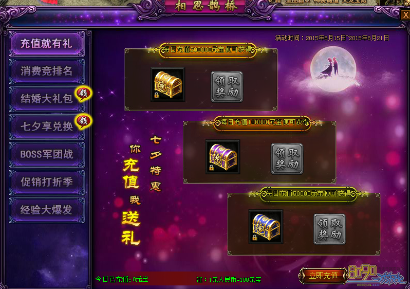 【活动内容】: 活动期间,每日累计充值元宝达到5W、10W和20W元宝时分别可领取一份丰厚的奖励!