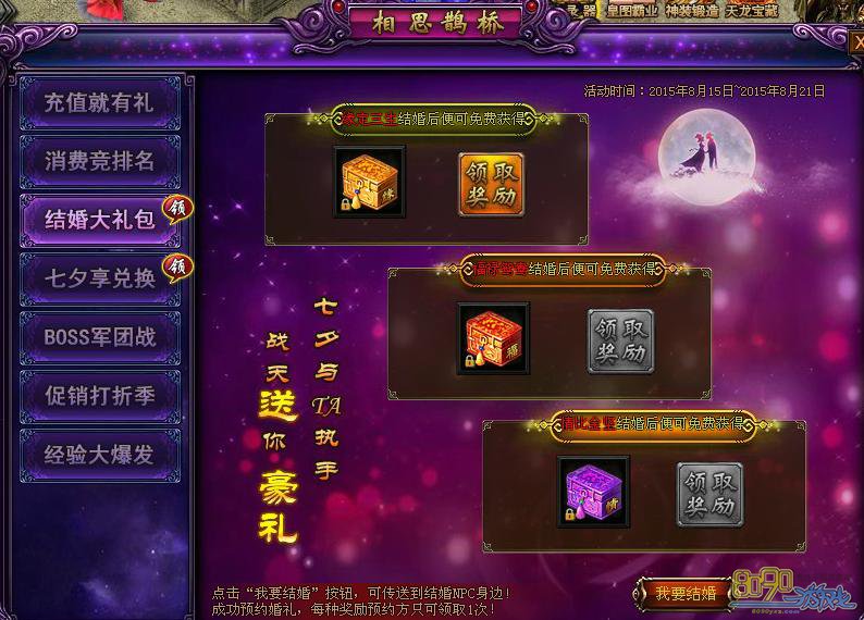 【活动内容】:活动中举办婚礼可获得对应的礼包,选择高级的婚礼模式可获得的礼包奖励越丰厚,礼包中含有大量增加亲密度的道具哦!