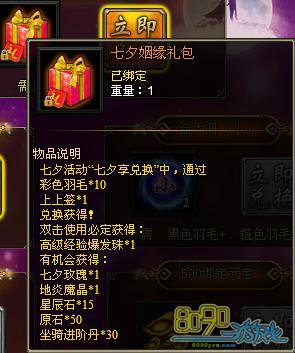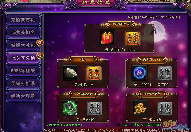 【活动内容】:活动期间,击杀精英及以上怪物可获得七夕特殊羽毛,不同种类的羽毛可在本活动界面兑换各种珍稀道具!每天0点重置!