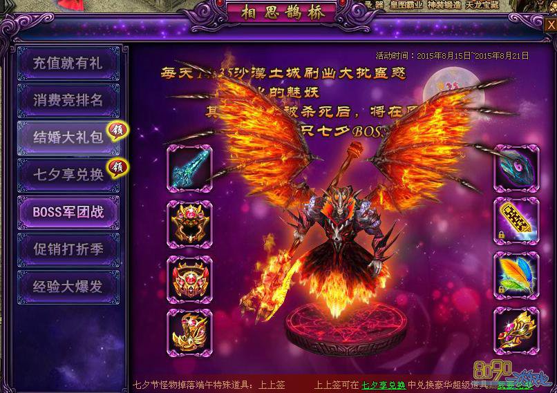 【活动内容】:活动期间,每天14:35沙漠土城刷出大批蛊惑人心的魅妖,其中有一只杀死以后,将在原地刷出1只七夕超级BOSS,击杀后有几率掉落东皇等高级装备以及七夕活动道具等。