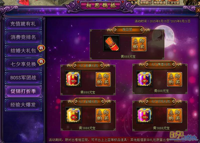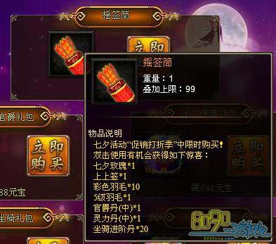 【活动内容】:活动期间,本界面出售大量折扣道具,超级优惠价格,速度秒杀有木有?另外还将出售价值888元宝1个的摇签筒,使用后有几率开出七夕特殊天兵——七夕玫瑰、上上签等七夕活动道具哦!