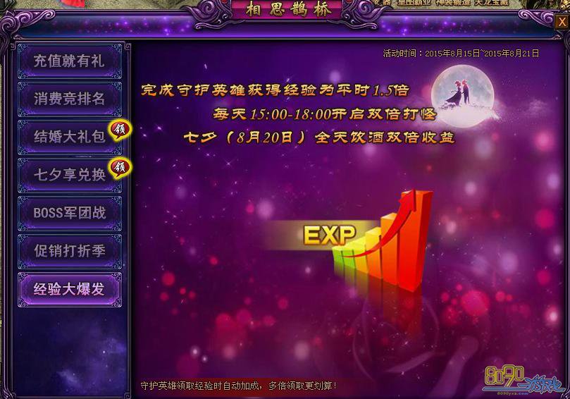 【活动内容】:活动期间,将开启多重经验爆发活动!活动期间完成守护英雄副本可获得1.5背经验(多倍领取可叠加哦),每天15:00~18:00开启双倍打怪活动,七夕节当天(8月20日)全天饮酒可获得双倍收益!
