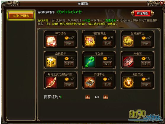 活动详情:活动期间,玩家每充值一元宝可获得一个充值红利,红利可用于购买活动中的丰富道具商品。注意:充值红利在活动结束后清零,请在活动期间内消费完哦。