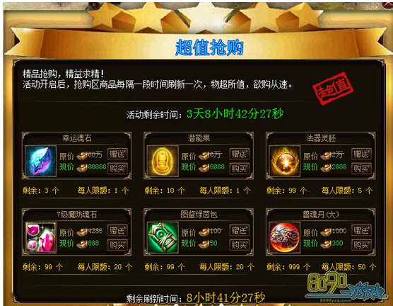 活动详情:活动开启后,抢购区商品每隔一段时间刷新一次,玩家可通过超低的价格抢购各种稀有道具,限量发售,物超所值,欲购从速!