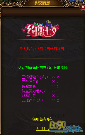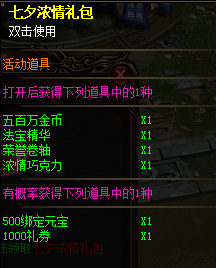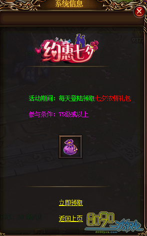 【活动内容】活动期间,等级75级以上玩家每天登录可以领取七夕浓情礼包