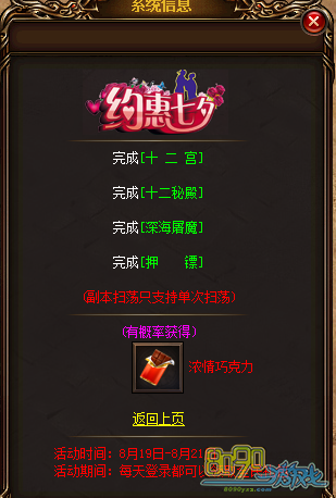 【活动内容】活动期间,完成十二宫副本、十二秘殿、押镖和深海屠魔副本有几率获得浓情巧克力(注:副本扫荡只支持单次扫荡)