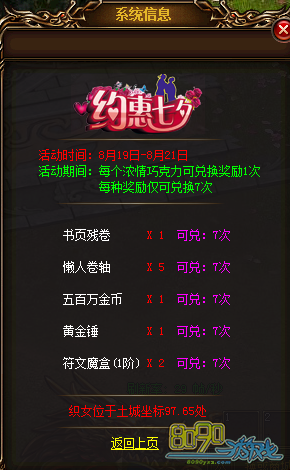 参与方式:玩家可打开右上角【节日活动】图标,或者在赤月皇城148,89【节日使者】处查看活动内容