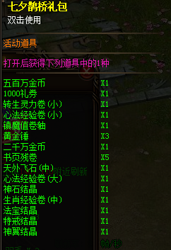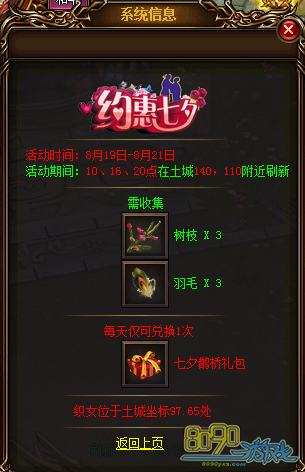 【活动内容】活动期间,10、16、20点在土城附近会刷新大量树枝和羽毛,可以用树枝和羽毛兑换七夕鹊桥礼包