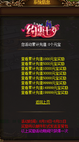【活动内容】在活动期间内累计充值一定元宝可获得大量功勋奖励(只可获得一次)
