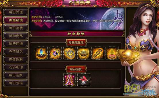 【活动说明】:活动期间,可购买多种折扣商品,全场最低低至4折!可消耗50元宝进行刷新,每天最多可刷新100次!全部购买后,将自动刷新!