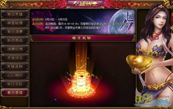 【活动说明】:每日充值金额达到一定条件时,可领取一份奖励,同时,其伴侣可获得一份奖励。当夫妻双方都充值相应档次的金额时,双方更可获得一份额外的奖励。