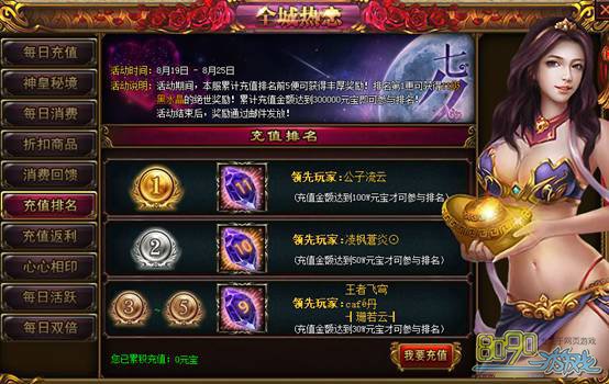 【活动说明】:活动期间,本服累计充值排名前5名便可获得丰厚奖励!排名第1更可获得11级黑水晶的奖励!累积充值300000元宝即可参与排名!活动结束后,奖励通过邮件发放!