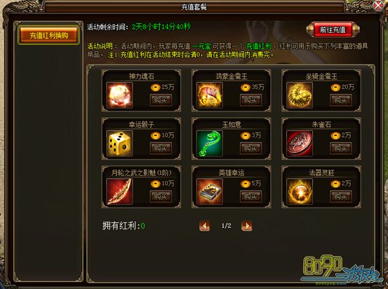 活动详情:活动期间,玩家每充值一元宝可获得一个充值红利,红利可用于购买活动中的丰富道具商品。注意:充值红利在活动结束后清零,请在活动期间内消费完哦。