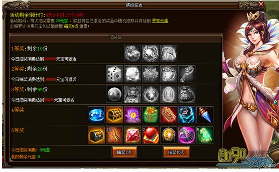 活动详情:活动期间,每次抽奖需要20元宝,奖励将在已激活的奖品中随机抽取并存放到寻宝仓库。全服累计消费元宝和奖励数量每天0点重置。