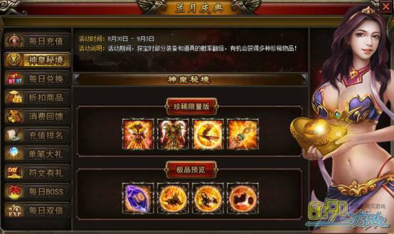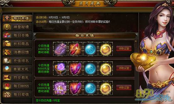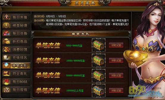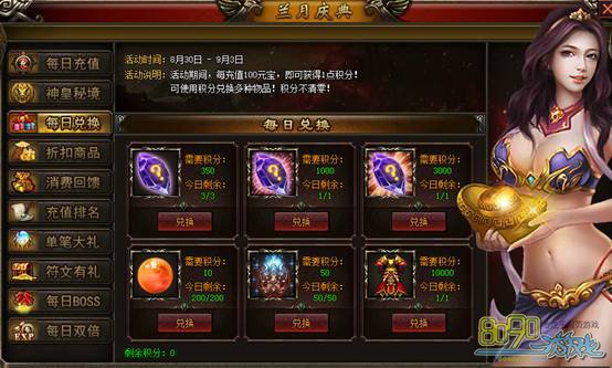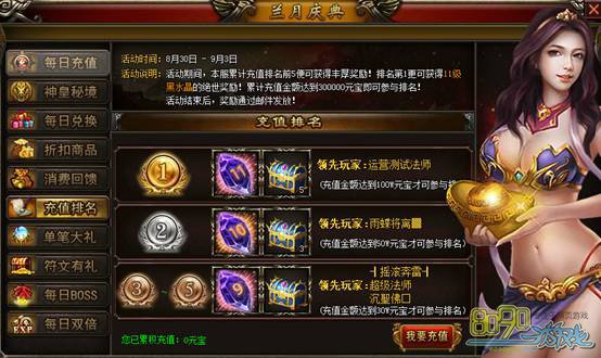 【活动说明】:活动期间,每充值100元宝,即可获得1点积分!可使用积分兑换多种物品!积分不清零!